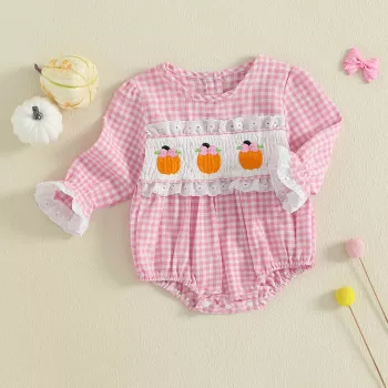 Baby Girl Halloween Plaid Romper – Long Sleeve Smocked Bodysuit for Fall